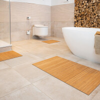 Die robuste Bambus Badematte besticht durch Langlebigkeit und hohe Qualität. Ein Badteppich aus Bambus bietet gleich mehrere Vorteile, denn er sorgt nicht nur für eine angenehm warme, wohnliche Atmosphäre, sondern ist auch besonders pflegeleicht. Anders als herkömmliche Badteppiche kann unser Modell aus massivem Bambus einfach abgewischt werden. Ob im Bad oder in der Küche, der Bambus Badeteppich macht sich dank seiner tollen hygienischen Eigenschaften überall gut und ist zudem auch auf Fliesen rutschfest!