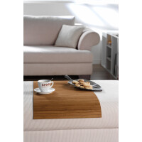 Gefertigt aus massiven Bambusstegen mit einer Breite von ca. 17 mm und einer Oberfläche aus 100 % Bambus überzeugt die Couchablage durch Stabilität und Langlebigkeit. Die versiegelte Oberfläche (außer PURE) schützt das Material vor Flecken und Feuchtigkeit – eine zusätzliche Pflege ist in der Regel nicht nötig. Die naturbelassene Variante PURE kann auf Wunsch individuell behandelt werden, um den natürlichen Charakter zu betonen.